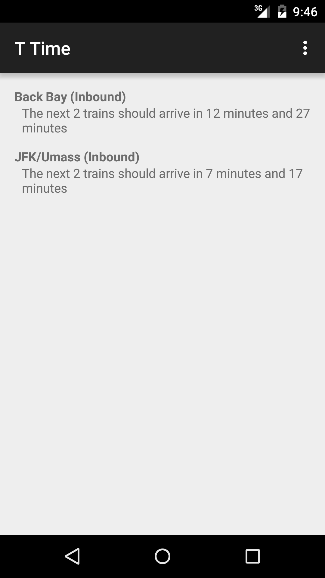 The exigency for the creation of this app is two-fold. Besides wanting to learn more Android, I want to make my own life easier. That may sound selfish, but it’s a totally great reason, I swear! I recently moved to Boston, Massachusetts. A great aspect about this place is the train system, which seems to go just about everywhere around. But this T (subway) thing presents a problem, however: How the heck should I know when the next train will be coming around?