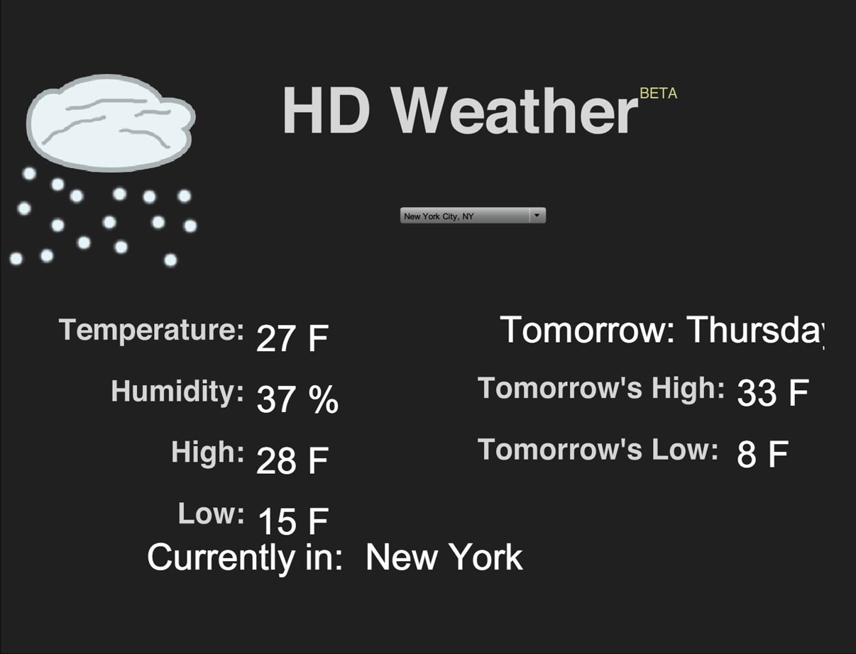 While in a programming class, our final project was to create an application which pulled data from some external source and displayed it in a meaningful way. I created this program which uses the Yahoo Weather API to pull data for the selected city and display conditions and a picture. While more proof-of-concept than practical, it showcases the power of external data and APIs. This requires the Flash plugin to view.