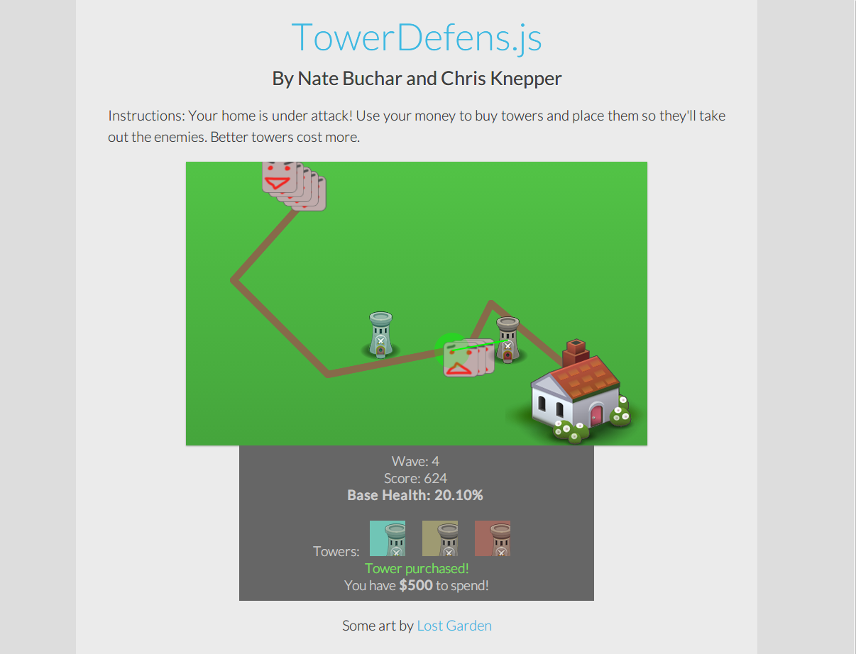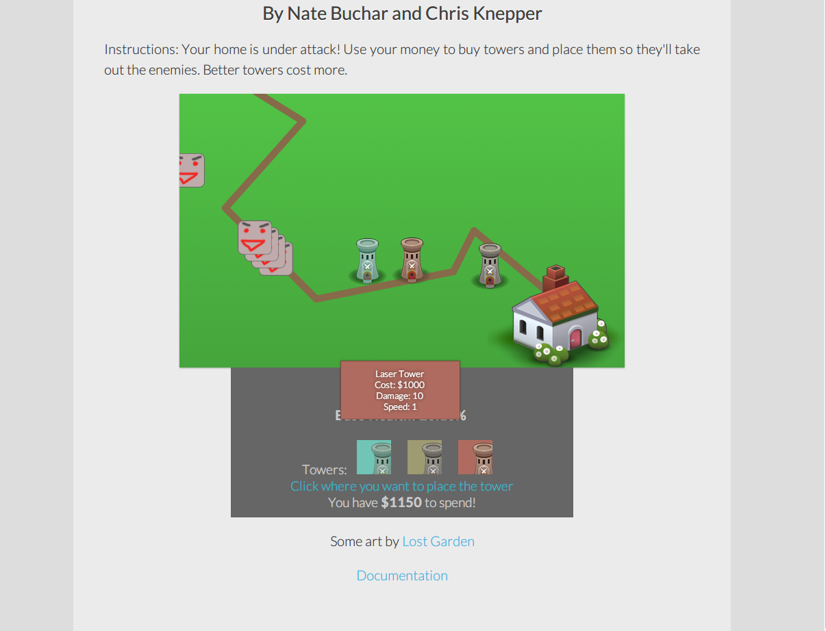 This Canvas/Javascript-based project is a standard tower defense game. It includes waves, scoring, “boss” enemies, items, and point-based pathfinding. Enemies follow the path toward the home of the player. The player must purchase weapon-firing towers to defend his/her home, lest the enemies destroy it!