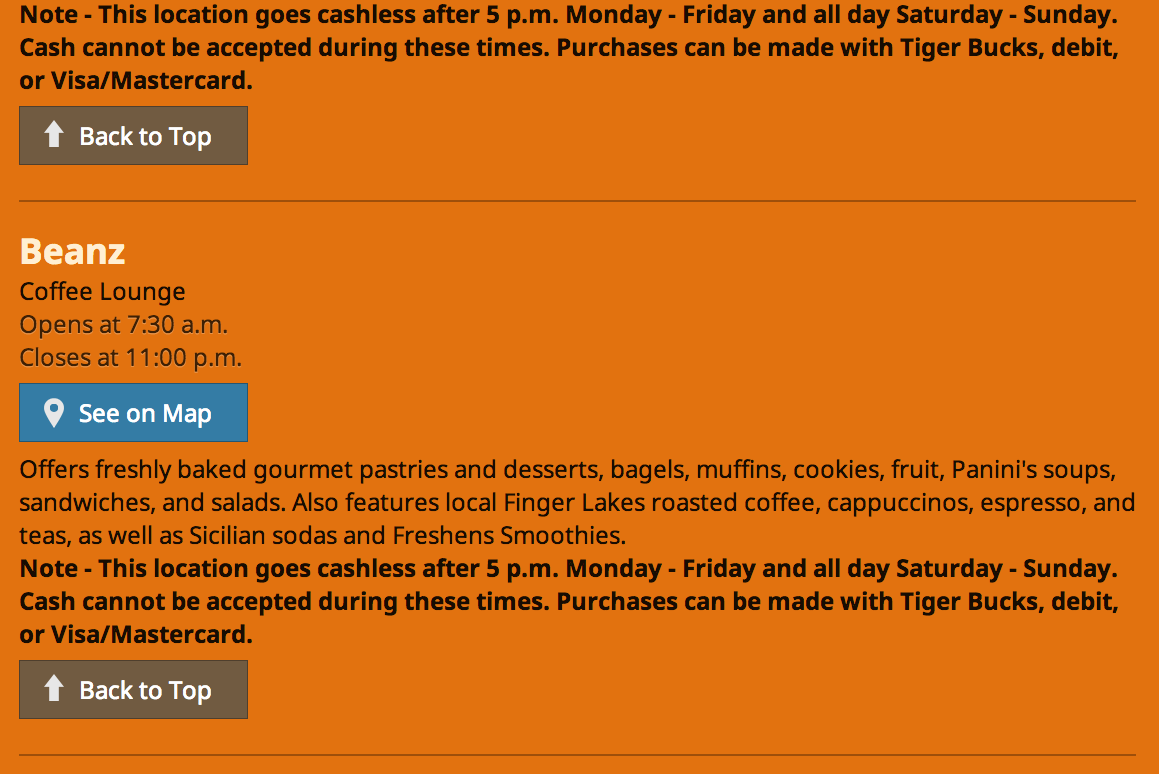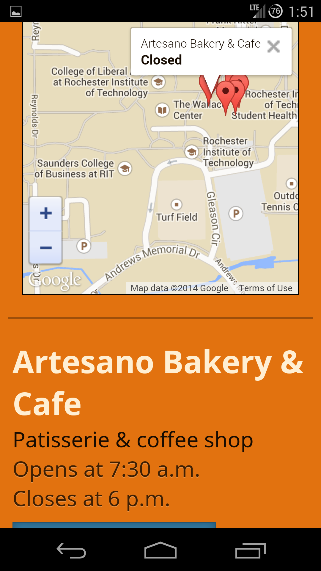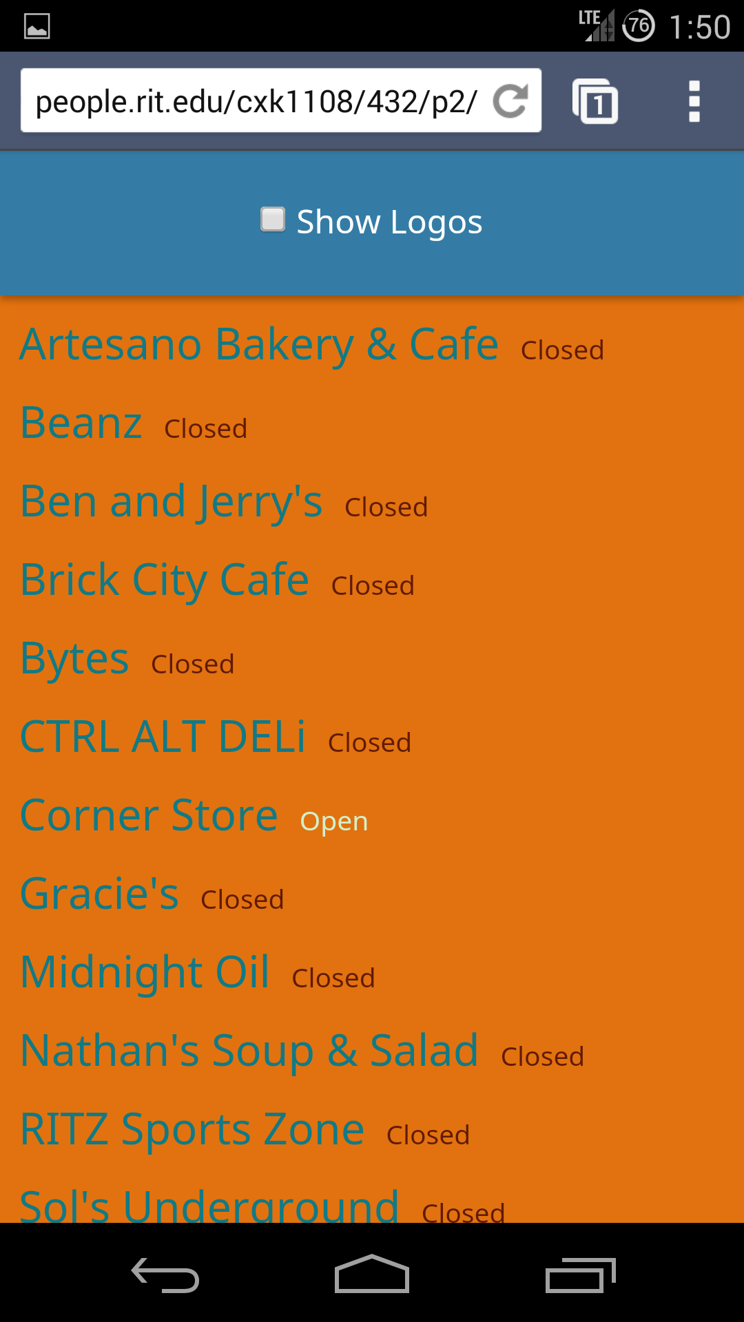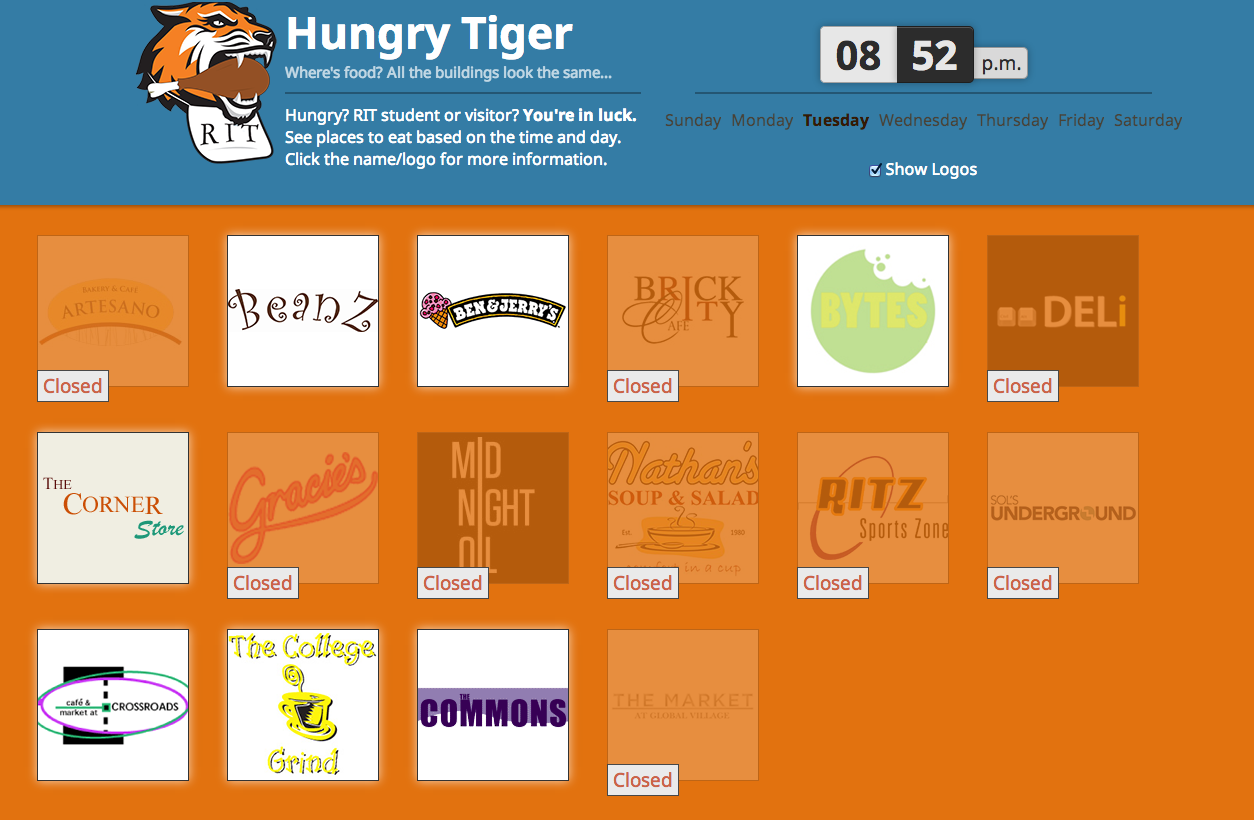 A class project and an exercise in client-side programming and DOM manipulation on the technical side. A way to tell, at a glance, which on-campus eateries are open on the user side. Meet Hungry Tiger. The app uses Javascript (including jQuery), along with the Google-derived API that RIT provides via its mapping service, http://maps.rit.edu/. The API returns information about RIT dining establishments, along with their opening and closing times…in a single string, such as “Mon-Thur: 9AM-10PM” or similar. This means that we had to write some Javascript to parse the strings and put the opening and closing times in an object, which could be compared against the user’s time. From there, we have whether the location is open in a Boolean variable. The app also features responsive styles, so it is usable on mobile devices.
