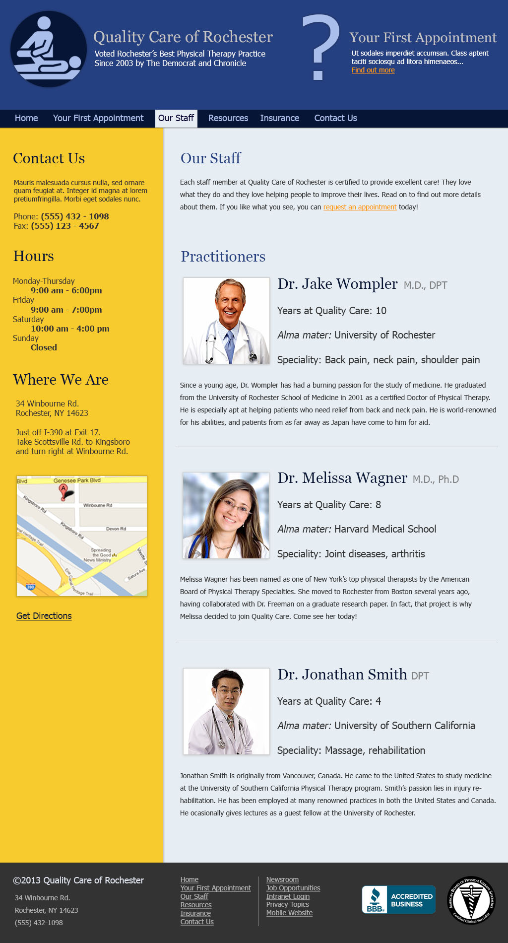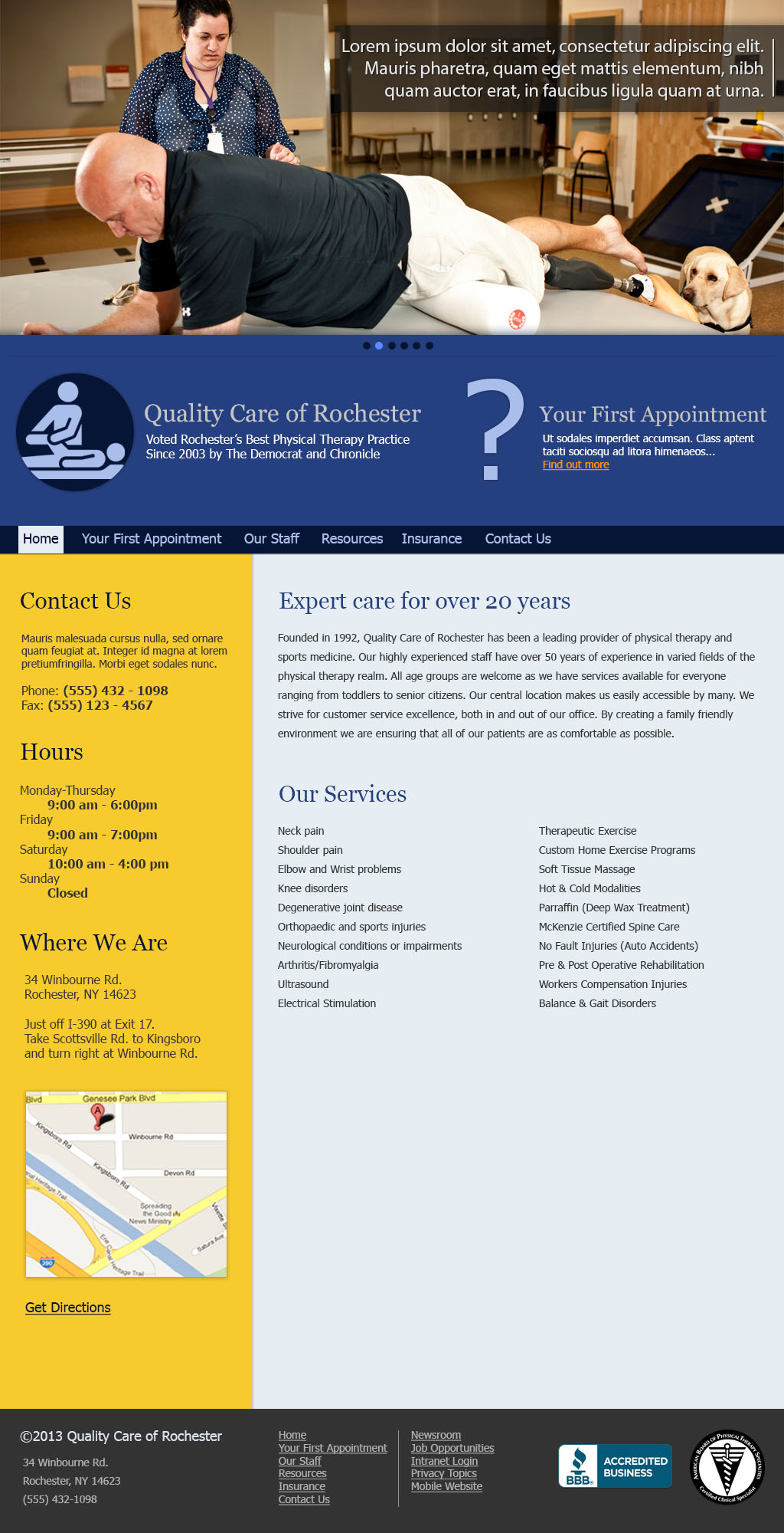 A (fictitious) physical therapy practice in Rochester, New York needed a website (because theirs was a 1990s GeoCities relic), so a team of crack designers including me created a simple yet functional concept. This was a class exercise in a GUI Design course at RIT. The site uses an easy-to-follow layout and prominent information to avoid any user stress.